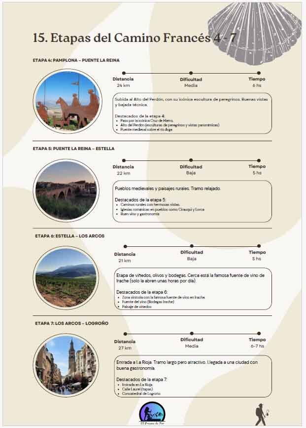 - Las 33 etapas del Camino Francés, con distancias, dificultades y tiempos estimados