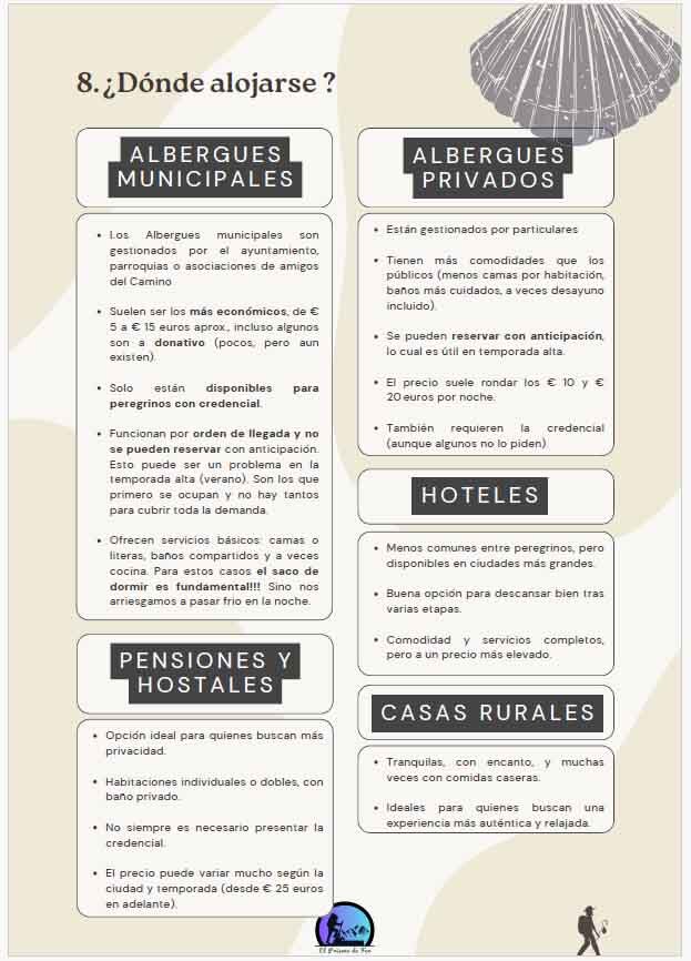 Explicación de tipos de Alojamientos, consejos, etapas, manejo de la mochila, etc.